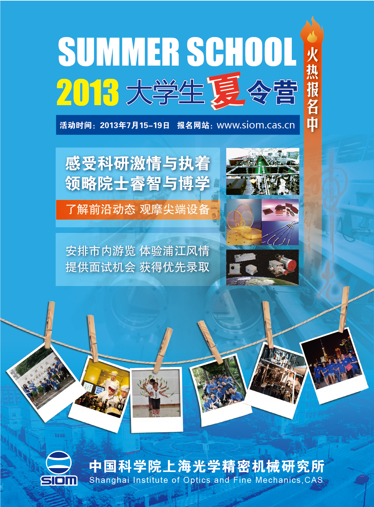 中科院上海光机所暑期大学生夏令营将于2013年7月15日至7月19日在上海举行。此次将安排学生参观实验室,聆听院士讲座,与导师和学生面对面交流活动等。同时,我们将安排上海市区观光游览。本所将提供营员的单程路费(实报实销高校所在城市至上海的火车硬座)及夏令营期间在沪的食宿。
