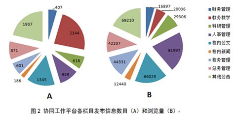 校内协同工作平台是教职工了解学校各项政策、规章制度、通知公告等相关信息的主要平台。截止2014年8月31日,学校各职能部门和院系在协同工作平台发布信息数目总共为9651条,信息种类涉及到财务、教务教学、科研、人事、公文等。2013-2014学年度,协同工作平台发布信息总数为675条,比上一学年度减少36.96%;浏览量为184464人次,比上一学年度增长10.63%。