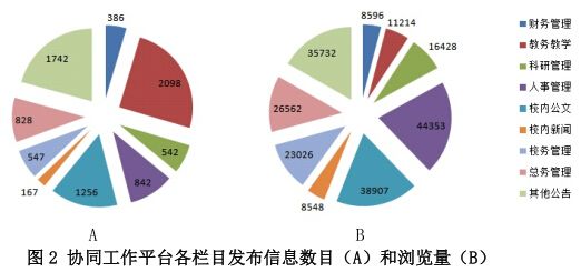 2.通过校内协同工作平台信息公开情况校内协同工作平台是教职工了解学校各项政策、规章制度、通知公告等相关信息的主要平台。截止2013年8月31日,学校各职能部门和院系在协同工作平台发布信息数目总共为8976条,信息种类涉及到财务、教务教学、科研、人事、公文等。其中,教务教学相关信息最多,达到2098条;而浏览量最高的则为人事管理,高达44353人次(图2A、B)。
